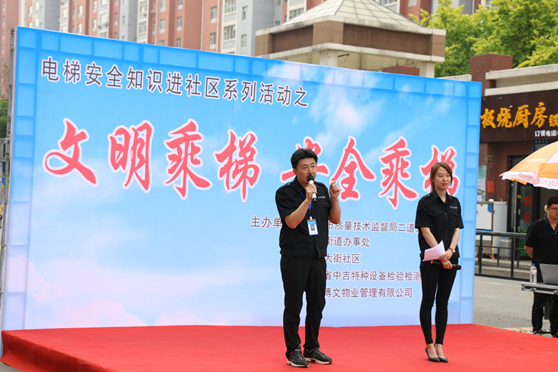 為迎接我國(guó)第十六個(gè)“安全生產(chǎn)月”, 6月17日上午9:00,由長(zhǎng)春市質(zhì)量技術(shù)監(jiān)督局二道分局、會(huì)展街道辦事處、會(huì)展大街社區(qū)、吉林省中吉特種設(shè)備檢驗(yàn)檢測(cè)有限公司、長(zhǎng)春博文物業(yè)管理有限公司,在福臨家園小區(qū)共同舉辦電梯安全知識(shí)進(jìn)社區(qū)之“文明乘梯 安全乘梯”宣講、電梯應(yīng)急救援演練兩場(chǎng)活動(dòng)。